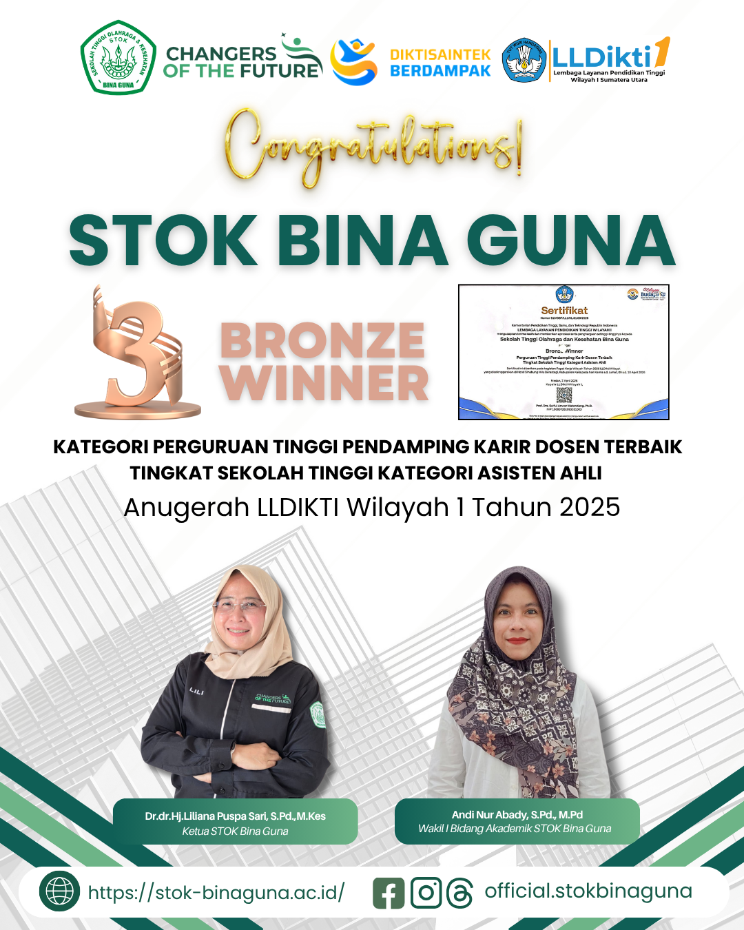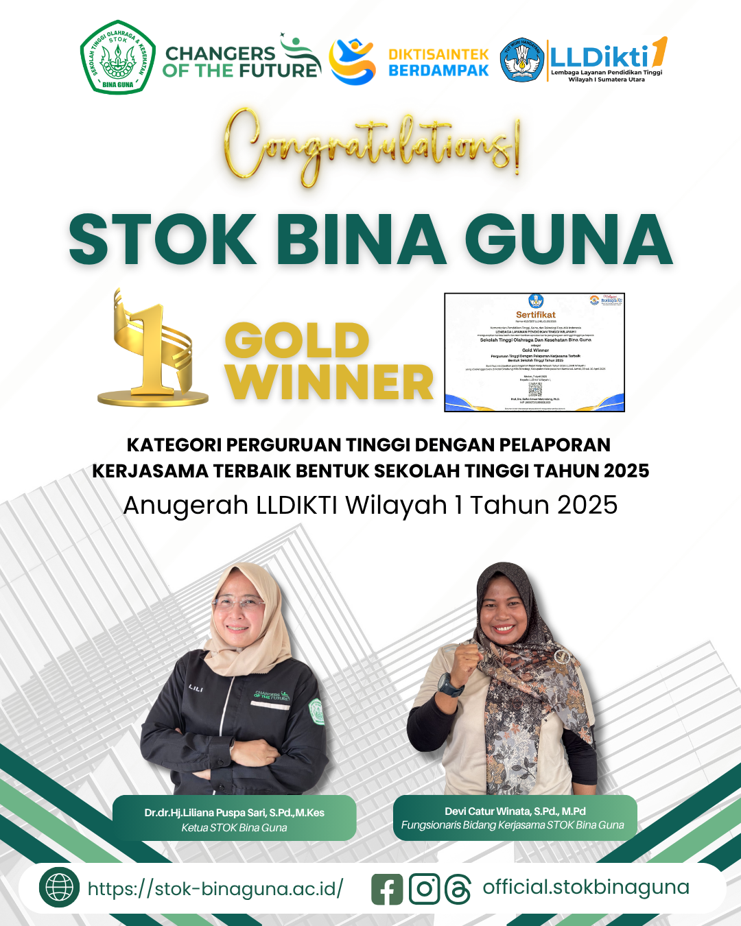 STOK Bina Guna menerima Penghargaan GOLD WINNER KATEGORI PERGURUAN TINGGI DENGAN PELAPORAN KERJASAMA TERBAIK BENTUK SEKOLAH TINGGI TAHUN 2025 pada Anugerah LLDIKTI Wilayah 1 Tahun 2025.