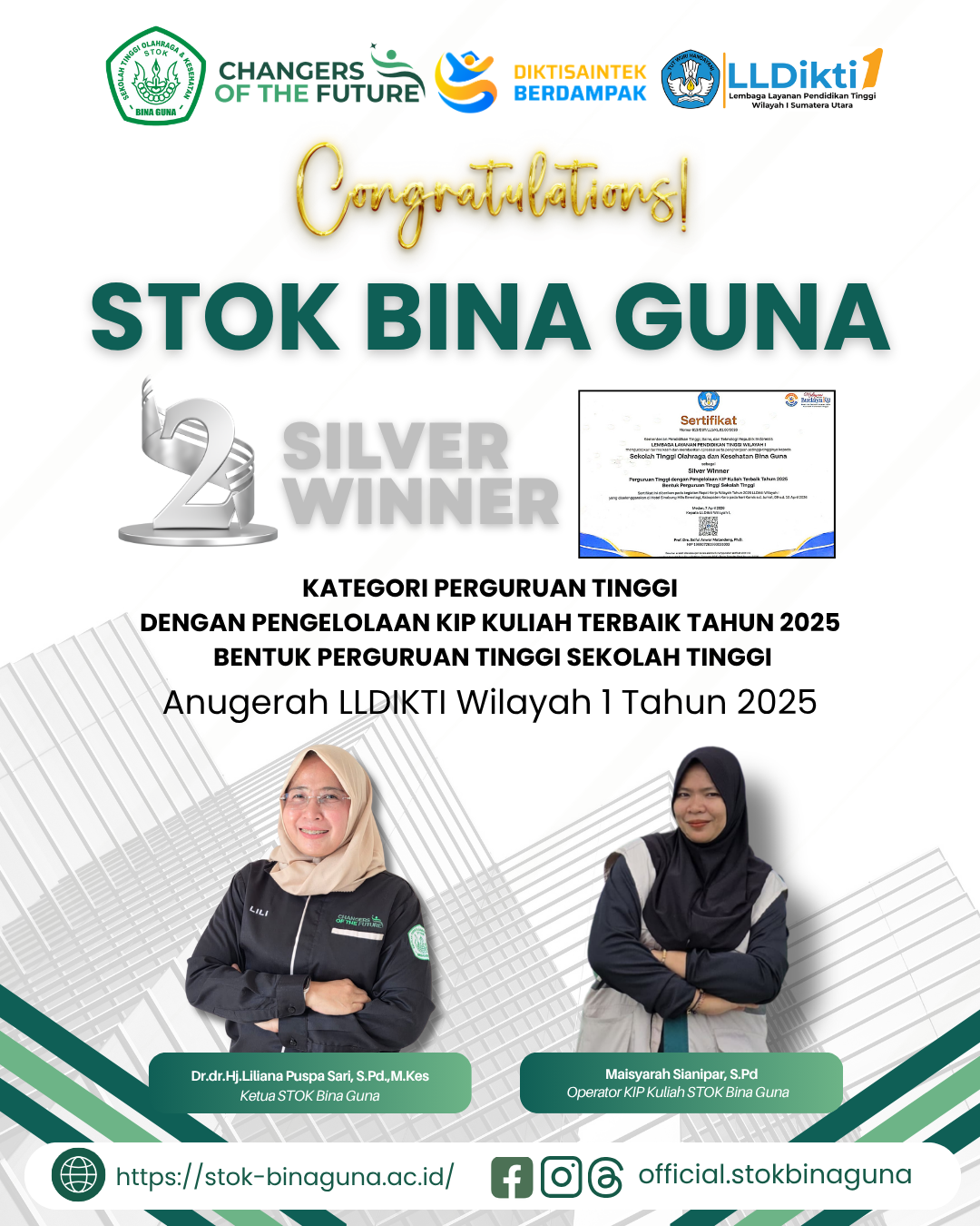 STOK Bina Guna menerima Penghargaan SILVER WINNER KATEGORI PERGURUAN TINGGI DENGAN PENGELOLAAN KIP KULIAH TERBAIK TAHUN 2025 BENTUK PERGURUAN TINGGI SEKOLAH TINGGI pada Anugerah LLDIKTI Wilayah 1 Tahun 2025