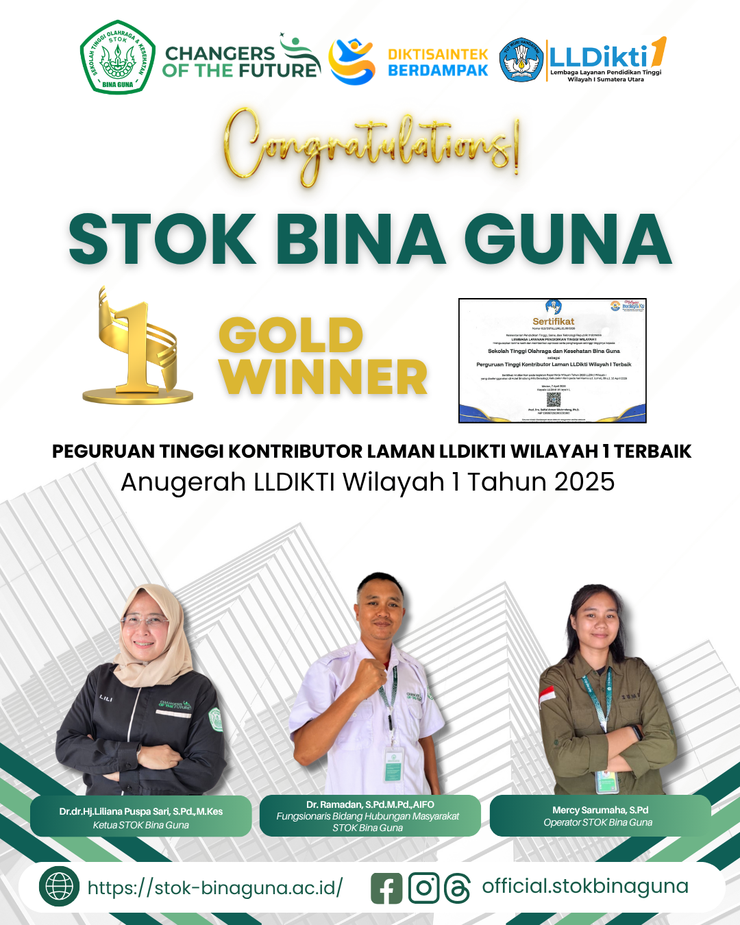 STOK Bina Guna menerima Penghargaan GOLD WINNER PERGURUAN TINGGI KONTRIBUTOR LAMAN LLDIKTI WILAYAH 1 TERBAIK pada Anugerah LLDIKTI Wilayah 1 Tahun 2025