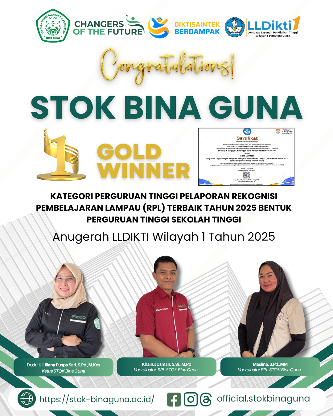 STOK Bina Guna menerima Penghargaan GOLD WINNER KATEGORI PERGURUAN TINGGI PELAPORAN REKOGNISI PEMBELAJARAN LAMPAU (RPL) TERBAIK TAHUN 2025 BENTUK PERGURUAN TINGGI SEKOLAH TINGGI pada Anugerah LLDIKTI Wilayah 1 Tahun 2025